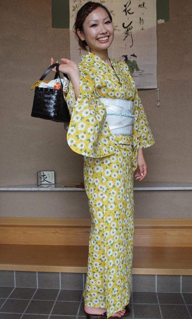 黄色いヒマワリ柄をたくさんあしらった浴衣に、